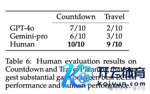 东说念主类在 Countdown 游戏和旅行筹算任务平差异管理了 10 个和 9 个问题,而最好的模子 GPT-4o 差异只管理了 7 个和 3 个问题。