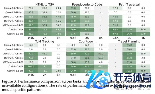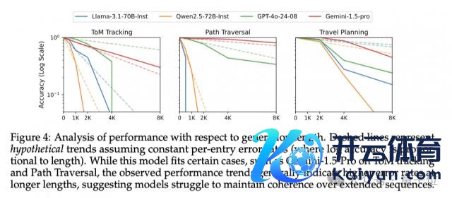 如图 4 所示,在 Theory-of-Mind 追踪、Countdown 游戏和旅行筹算任务这些需要处理更复杂的信息、进行更长链的推理的任务中,模子性能的着落幅度齐更大,GPT-4o、Qwen 等模子的精准度甚而直线着落。