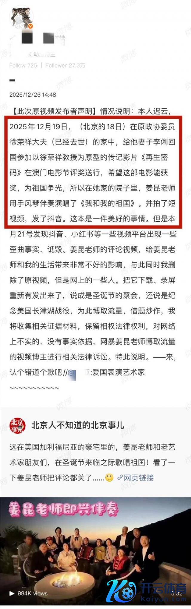 在姜昆助理修起之后,网传视频的拍摄者先是发文修起,后又出面修起了。